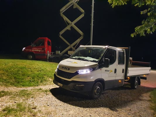 Die neuen Scheinwerfer werden installiert und ausgerichtet, vielen Dank an Peter Wismer, Alex von der Firma Niklaus und Firma Schilling für die Hebebühne!